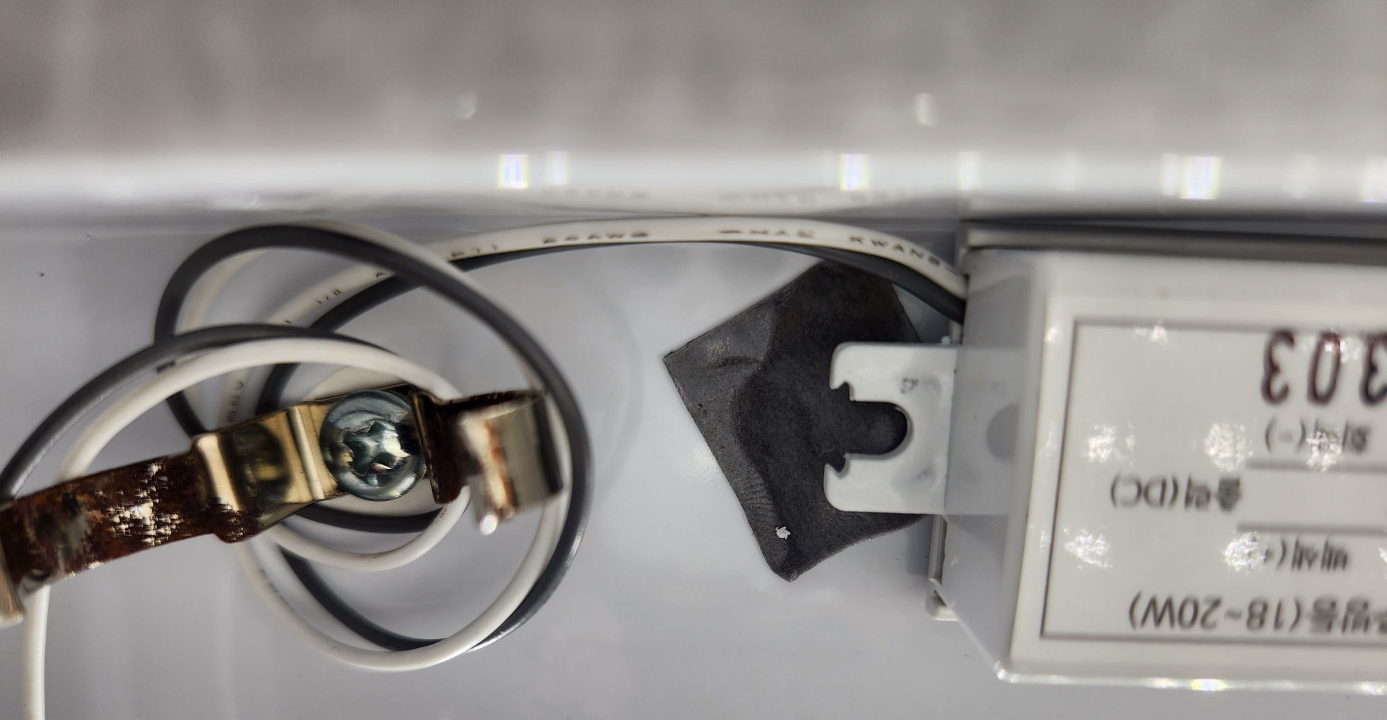 나사를 어느 정도 빼면 안정기의 전선이 분리됩니다. 보면 흰색과 검은색 구분이 있습니다. 이 색을 맞춰서 LED 안정기 전선을 연결해야 합니다.