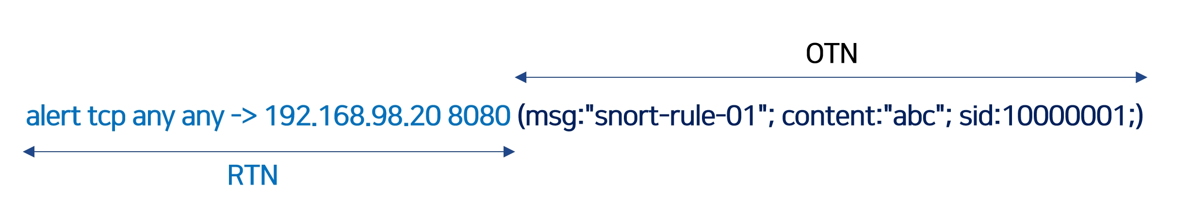 괄호 안의 msg:"snort-rule-01"; content:"abc"; sid:10000001; 부분이 OTN 이 됩니다.