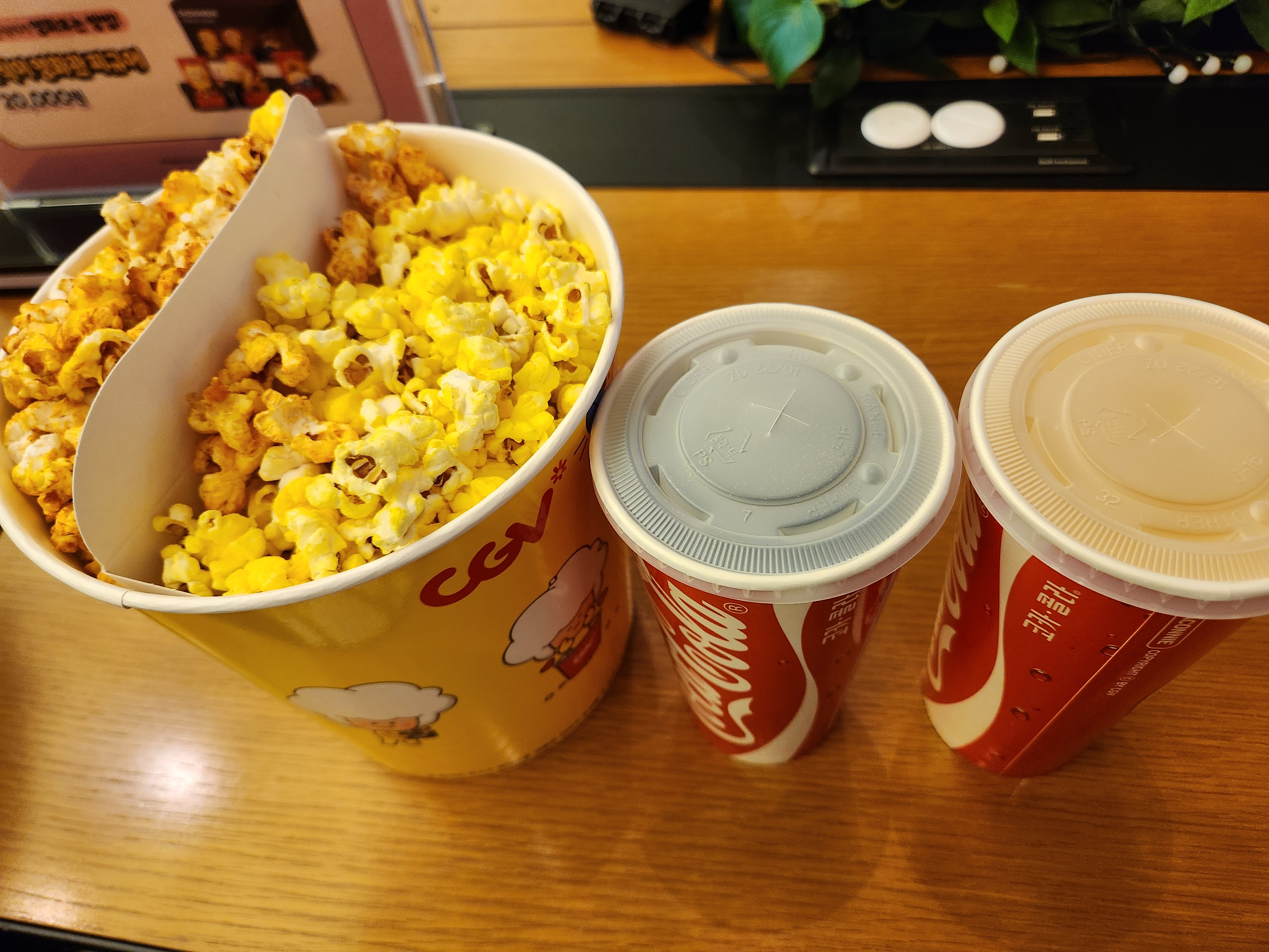 저는 캐러멜과 고소한 맛으로 반반팝콘을 , 음료는 기본 탄산을 선택했습니다.