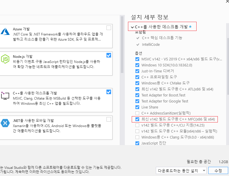 [설치 세부 정보] - [C++ 을 사용한 데스크톱 개발] - [최신 v142 빌드 도구용 C++ MFC(x86 및 x64)]