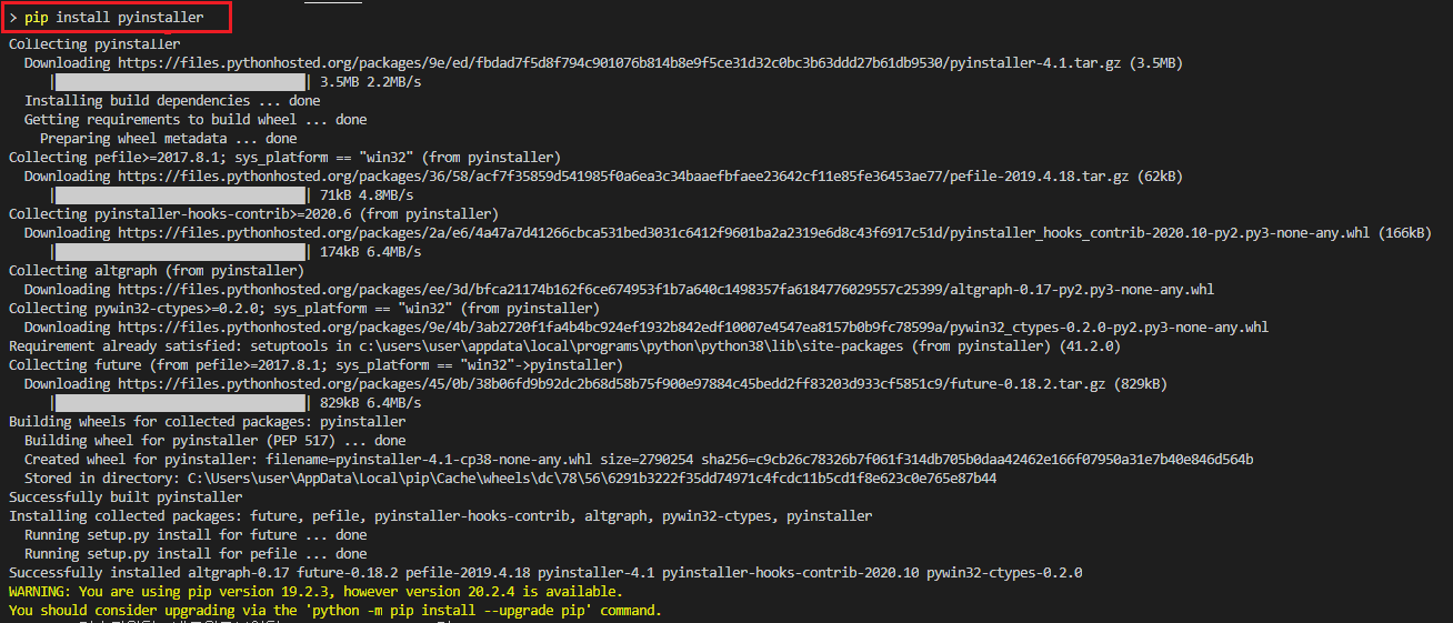 다음과 같이 pyinstaller 를 설치할 수 있습니다.